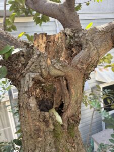 特にスダジイはこのような状態でも一見元気そうです。ただ「うろ」が入った枝はどうしても折れやすくなるので、枝の付け根から切除するのが望ましいです。特にスダジイは萌芽力が強いので幹や太枝を伐採しても、また切り株から新しい芽が生えてきます。